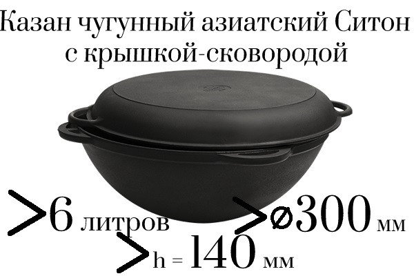 Казан чавунний азіатський в комплекті з чавунною кришкою сковородою ТМ Термо. Виробництва НВП Сітон, м. Дніпро. Об'єм - 6 літрів. Діаметр по кришці - 300 мм. Глибина (по центру) - 140 мм. Вага казана з кришкою - 6,2 кг.